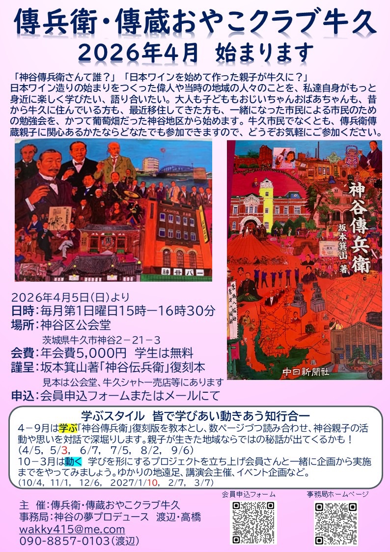 一緒に学び合い一緒に動きませんか。学び想い夢を形にしていくプロデュースのチカラを一人ひとりに、仲間に、地域資産に育てて行きましょう。誰でもできます。私でも出来ましたから。ひとりだけでは難しいことも応援し合えば何とかなります。傳兵衛さん傳蔵さんは、そうして日本ワイン造りを形にしていったのでしょう。そうですよね、傳兵衛さん? 神谷傳兵衛さんのことをもっと知りたい、とAmazonで赤本をポチっとし、傳兵衛クラブ刈谷なる市民団体があることを知り、刈谷まで代表の川口さん事務局の村井さんに会いに行き、赤絵作者の斎藤吾朗先生、赤本復刻版製作者の味岡源太郎さんをご紹介頂き、牛久で仲間を得て、神谷地区公民館を借りることができました。 4月5日(日)15時からの初回はこんな内容。私がやるので、ゆるいです。 ・設立趣旨の説明 ・会員自己紹介 ・教本「神谷傳兵衛」謹呈と説明 ・読み合わせ「はじめに」p1-6, p46-48 ・対話「なぜ、大正時代に坂本さんが、平成時代に味岡さんが本を出そうと思ったんだろう」 ■ ■ 申込フォームはこちらから 16:30から18時までは、日本ワインとご近所カスミのお惣菜持ち寄り懇親会を開きます。参加費無料、ひとり1本1品持ち寄り下さい。公民館には冷蔵庫、簡単な調理器具もあります。題して「カスミde日本ワイン」飲まない方はお好きな飲み物を。 ※定例会は毎月やりますが、参加は任意です。 参加できる月だけでもお集まり下さい。開催レポートを送る他、オンラインコミュニティもつくる予定です。教本は、初回来られない方には郵送します。 |